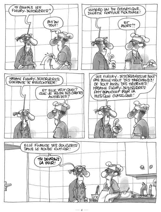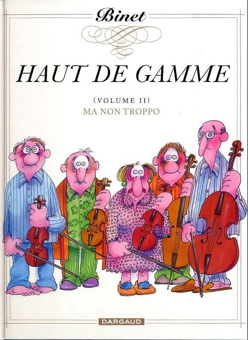Dans ce deuxième volume de Haut de gamme, Ma non troppo, Christian Binet propose trois histoires assez amusantes autour de la musique que le lecteur peut découvrir en parallèle : un groupe de punk composé de trois membres souhaite s’exercer à l’orgue. Alors qu’une femme bien sous tous rapports essaie de l’enseigner à l’un d’eux, ce dernier souhaite déstructurer l’œuvre de Jean-Sébastien Bach, Passacaille. La deuxième histoire : un quintet qui s’exerce sur La truite de Schubert depuis 15 ans a enfin la possibilité de la jouer en public. Problème : ils sont narcoleptiques. Et enfin, un chef d’orchestre non reconnu par ses pairs doit donner des cours à Madame Fleury-Descrières, une riche femme et notamment lui apprendre Auf flügeln des gesanges de Félix Mendelssohn. L’homme passablement énervé aimerait mieux continuer de jouer avec sa batterie de cuisine. C’est plutôt drôle, bien écrit, cet album interroge les hommes sur leurs relations à la musique classique. Néanmoins, Christian Binet n’apporte pas autant de magie que dans ses autres publications comme Les Bidochon.