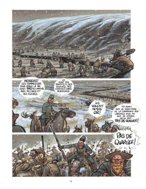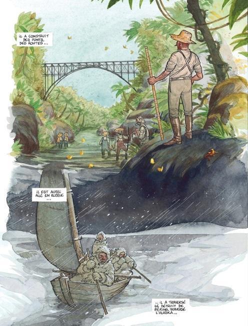 Né en Roumanie sous le prénom de Iuliu, francophile et francophone, il étudie en France la géographie et la géologie et sera même diplômé de l’Ecole Nationale des Ponts et Chaussées en 1879, l’homme se dévoile complexe dans ce bel album sous la plume de Matz. Le scénariste ne cache pas le quasi génocide des Onas qu’il entreprend dès qu’il arrive. Fort caractère et sans être un être sanguinaire, il ne reniera rien de ces épisodes arme à la main que Roca, le président appréciera énormément. Inarrêtable et d’une imagination débordante, il veut installer le télégraphe, il fait installer des laveries pour minerai et des troupeaux de moutons. En somme, un personnage dans la lignée des héros de Jules Verne. Très documentée, cette belle biographie est à la fois haletante et interroge sur le pouvoir.