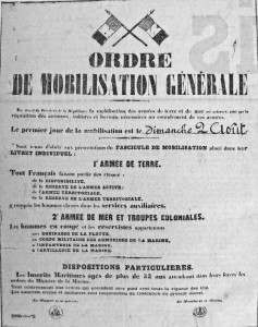 A Bar-le-Duc où nous arrivons à 3h du matin nous apprenons que la mobilisation générale vient d’être ordonnée. Des bruits circulent : un garde-champêtre, première victime de la guerre, a été tué hier soir par les Allemands à Sainte-Marie-aux-Chênes. A cette nouvelle, des vociférations s’élèvent des wagons où je croyais tout le monde endormi. « A Berlin ! A Berlin ! » Du sang a coulé : les voilà ivres de sang… parce qu’ils n’ont plus de vin à boire.
