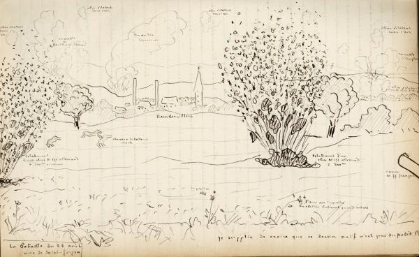 La canonnade redouble d’intensité. Je n’y tiens plus de curiosité. Je veux aller voir la bataille. Je n’en dis rien à personne pour que le commandant l’ignore, je préviens seulement Caussade et à 1h je pars à bicyclette pour Rambervillers.