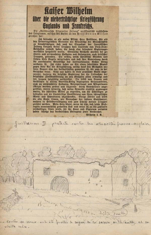 Je sors de la grand’messe à Neufmaisons. Voilà un des rares villages où il y ait encore une église – aussi accuse-t-on le curé de faiblesses envers les Allemands – Je sors d’une grand’messe pendant laquelle chants liturgiques et prières murmurées se mêlaient au bruit terrible du canon. Pendant le Credo ç’a été un éclatement incessant d’obus, comme si les sinistres iconoclastes qui n’ont plus qu’un pied en France voulaient briser jusqu’à la voix de nos croyances. Mais le Credo n’en était chanté qu’avec plus de vigueur et c’était une minute empoignante, ce duel entre un idéal de beauté et de bonté et un idéal de brutalité et de grossièreté. C’est cependant le premier qui triomphera du second quelque puissants que soient les canons…