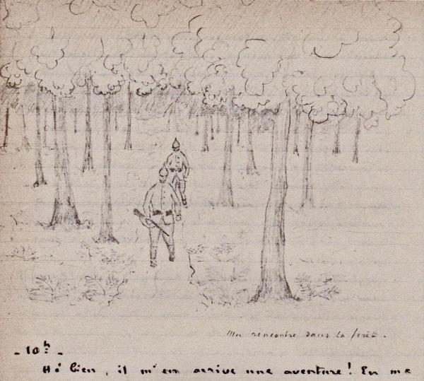 Arrivé à un grand tournant du chemin vers lequel descend un ravineau, j’entends un bruit de pas à ma gauche ; je pense à des patrouilleurs français. Je regarde. Là, au-dessus de moi, à trente mètres, deux Allemands s’avancent, l’arme à la main, marchant l’un derrière l’autre. Mon sang ne fait qu’un tour et je n’ai qu’une idée, dans mon trouble : les faire prisonniers. Je m’arrête au bas du sentier qu’ils descendent et, sortant mon gros revolver, je les en menace en leur criant : « Rendez-vous, rendez-vous ! ». Ils s’arrêtent, ils semblent hésiter, puis reprennent leur marche vers moi, sans faire le moindre geste de menace. Je me dis : ils ne jettent pas leur fusil à terre, c’est donc qu’ils ne veulent pas se rendre… ils se dirigent vers moi, c’est donc qu’ils cherchent à me faire prisonnier. » Et je tire dessus. Les voilà aussitôt qui détalent à toutes bottes, grimpant le sentier des pieds et des mains : je les injurie, je les traite de toutes sortes de noms d’animaux, je vocifère ; à mes cris, le second se retourne, je crois qu’il va épauler ; je me place derrière un tas de bois et cette fois-ci, visant convenablement, j’essaie de lui envoyer une balle : mon revolver ne marche pas ! Les deux premières balles sont parties, impossible de déclancher le chien sur la troisième cartouche… Mauvaise minute ! Alors, je me retourne et, faisant semblant d’appeler des hommes derrière moi je fais de grands gestes et je crie : « Feu ! Feu ! »… L’Allemand, qui ne s’était arrêté qu’une seconde, et, qui évidemment, ne se doutait pas de l’arrêt de mon revolver, repart en courant et disparait avec son camarade au sommet du sentier.