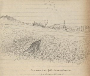 J’ai voulu atteindre le « château Poincaré » à Sampigny. Il se trouve sur une pente à l’ouest de la ville. A 500m de l’enclos j’ai laissé ma bicyclette dans un fossé et je me suis avancé en marchant à quatre pattes dans un champ de betteraves. Silence. Pas un obus sur la ville. Allons-y !… Je continue mon lent voyage sous l’œil terrible du Camp des Romains qui m’observe de là-bas. J’ai fait 150m… Je me couche pour me reposer car c’est fatiguant de marcher sur les mains… Je tire mon kodak de sa sacoche… je vais photographier déjà ce que je vois, au cas où je ne pourrais aller plus loin… Là-haut un avion allemand entouré de panaches de fumée vole sur ma tête… Je cherche des yeux une pierre sur quoi poser mon appareil… Je n’en vois point. J’avise alors à quelques mètres de moi un petit tas de fumier qui fera mon affaire… J’oublie de ramper pour y atteindre… Mes 180 centimètres sont probablement repérés instantanément par l’œil du Camp des Romains car
