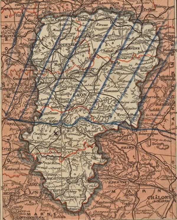 6h Je me dirige vers Soissons par un chemin boueux qui serpente entre des betteraves. A mesure que j’en approche le bruit de la bataille se fait mieux entendre. Des obus sifflent, puis éclatent. Des obus français leur répondent. Les coups de feu font des pan !… pan !… pan pan ! irréguliers, isolés par instants, et soudain précipités. Les mitrailleuses, de temps en temps, leur coupent la parole et leur caquetage résonne dans les vallées. Tout cela se passe dans le brouillard. Je ne vois point les troupes, j’entends leur présence.