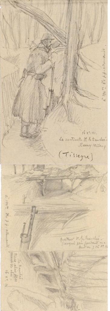 … Nous avons eu aujourd’hui plusieurs hommes tués dans les tranchées : ce sont ou des distraits ou des bravaches : des distraits qui ont dépassé de la tête la ligne de la terre protectrice, des bravaches qui se sont montrés au-dessus de cette ligne « histoire de voir des boches ». Tout ce qui dépasse la terre est immédiatement touché d’une balle.