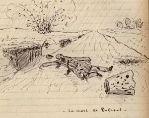 Après le déjeuner je gagne les tranchées du 4ème bataillon dont je dois assurer le service médical, en même temps que celui du 2ème. Quand j’arrive au poste de commandement du Ct. Sabattier je vois tous les hommes blottis dans les niches du talus…  « M’sieu le major, vous allez recevoir des pruneaux !… » Un sifflement… Je me mets à mon tour dans une niche… Pâff !.. Un percutant tombe sur un des abris… Un sifflement… Pâff ! un autre sur le chemin… Un sifflement… Pâff ! encore un sur un abri… Un sifflement… Pâff ! Celui-là nous couvre de terre… La salve est terminée… je sors. Un cadavre est là, noyé dans le sang et la boue ; la capote, le pantalon, le képi sont déchiquetés. Le sang qui coule en une petite rigole fume dans l’air humide… A côté du mort, une lessiveuse et un tuyau de zinc troués comme une passoire… C’est le troupier qui passait il y a un instant et à qui ses camarades criaient : « Dubreuil tu vas recevoir des pruneaux ! – Penses-tu, a dit Dubreuil. » Et Dubreuil a reçu cinquante pruneaux de plomb et d’acier dans les jambes, le ventre, la poitrine et la tête. Et il est là tout mou, tout chaud, les bras en croix dans la boue et sous la pluie fine…