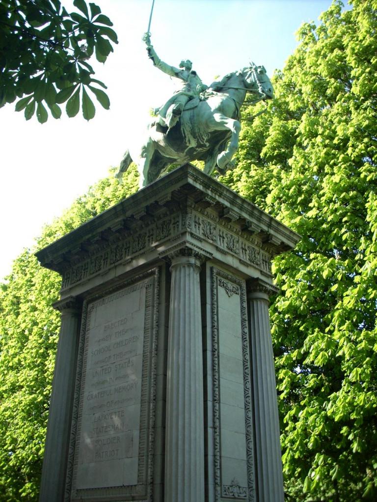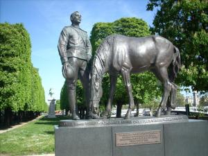 Clin d’oeil, cette composition sans emphase associant un officier et sa monture, au repos, se trouve dans l’alignement du monument célébrant l’épopée américaine de La Fayette, à l’autre bout de ce jardin.La Fayette.