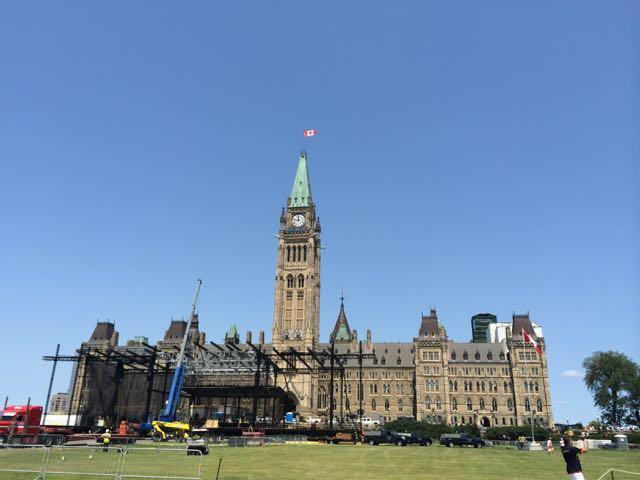 (Le bel édifice est masqué par une scène de musique dressée pour célébrer la fête nationale du Canada, le 1er juillet, qui célèbre l’indépendance du Canada vis à vis du Royaume-Uni.)