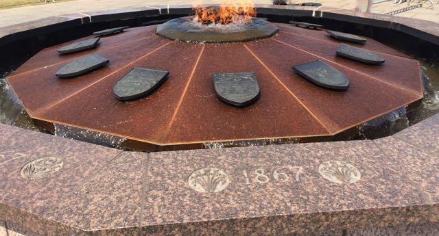Entourée des écussons des provinces et territoires canadiens, et brûlant au-dessus de l’eau de la fontaine, la Flamme du centenaire symbolise l’unité canadienne.