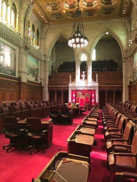 La salle du Sénat accueille la reine ou son représentant, le gouverneur général, lorsqu’elle sanctionne un projet de loi et 105 sénateurs nommés par le gouverneur général sur recommandation du premier ministre.