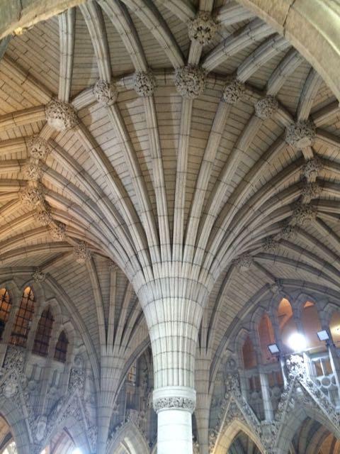 Le plafond de la Chambre des communes est fait de lin, arborant les symboles des armoiries du Canada, des provinces et des territoires.