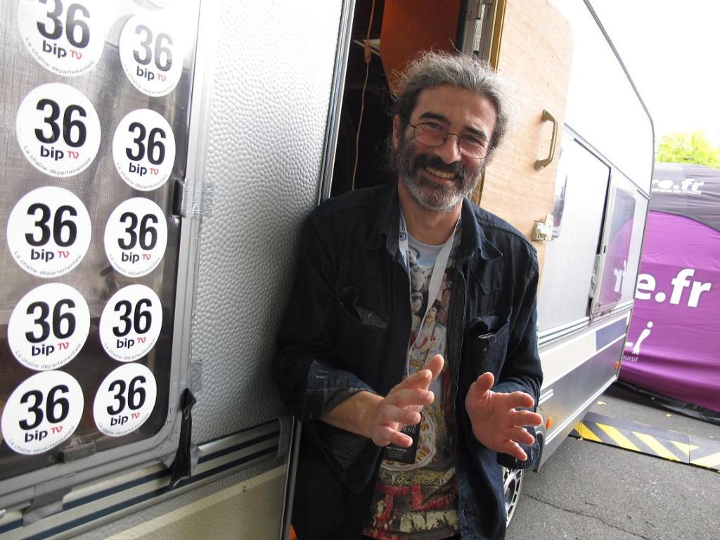 Éric de Bonnarme, figure (hirsute) incontournable du festival Darc, quinqua natif du Blanc, revenu en Berry après vingt années dans le Nord, de Lille à Roubaix, ne nous a pas offert le temps d’admirer ses fameuses chaussettes aux motifs de flammes que tout le Berry lui envie. Il a embrayé volontiers sur l’interview en charentaises. Pas pour parler des cours de marketing et d’économie qu’il dispense à la fac de Châteauroux, ni pour évoquer sa croquante rubrique financière « Èco de comptoir », chaque mardi, à 19h30, sur la radio locale associative Balistiq… mais bien pour répondre à nos trois questions qui deviennent donc un nouveau rituel sur le blog. On aura bien le temps, un jour, de parler de toutes ses vies, de restaurateur ou de patron de brasserie avant, sourit-il, de « faire un peu de pub pour m’amuser ».