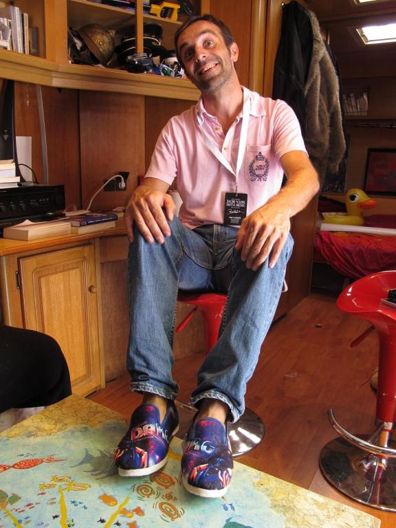 Bon, résumons. « L’interview charentaises », ce sont ces trois questions rituelles quotidiennes posées à un aficionado de la Darcosphère avec, en guise de cerise sur le gâteau, ces inqualifiables charentaises aux couleurs de Darc que notre interlocuteur doit enfiler fissa, sous peine de… On n’en dira pas plus. Enfin si : l’exercice imposé a lieu chaque jour sur le site de la place Voltaire dans la caravane de Sieur Éric de Bonnarme, que l’on surnommera aujourd’hui César, car il faut rendre à César ce qui lui appartient. « L’interview caravane » qui se déguste dans Berry Sports est son œuvre. Pas sûr en tout cas que César avait des chaussettes avec de telles flammes imprimées dessus.