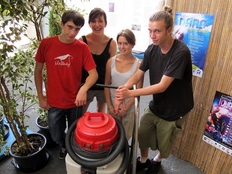 Ont-ils l’air malheureux Mickaël, Alice, Julia et David (de gauche à droite) ? Ok, sur la photo il manque Guillaume, Coraline, Nicolas, Morgane et le chef de cette jeune tribu, Lilian. Mais il ne manque surtout pas R2D2. L’aspitateur affublé du surnom du fameux petit robot de Star Wars est en action dans les loges chaque soir après le départ des artistes et le matin, de bonne heure, pour faire place nette. Les étudiants castelroussins, pour la plupart bénévoles sur Darc depuis l’an passé, apprécient. « Si on revient, c’est que c’est bien », s’amuse David. L’ambiance des loges, la rencontre avec les artistes… ils adorent. Ils ont vécu quelques petits moments assez spéciaux comme l’après-concert de Nolwenn Leroy. « C’est son backliner qui a passé l’aspirateur dans sa loge ! ». Lilian en rigole encore.