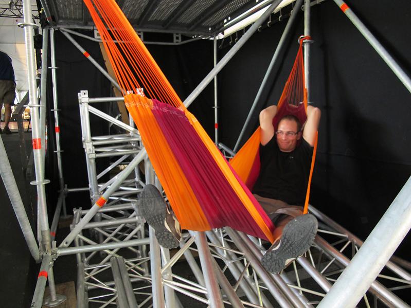 Levez la tête et vous en verrez plein la régie. Il y en a même de cachés sous la scène. Le hamac est le refuge privilégié des techniciens du festival qui ne ménagent pas leurs efforts et qui, comme Simon, ici, le Lillois technicien lumière, s’offrent parfois un petit break dans ces tissus colorés. « Le hamac, c’est l’objet culte », confie-t-il, une plume sur le coin de l’oreille… comme un clin d’oeil au spectacle final des stagiaires, vendredi, qui aura pour thème « La danse de la plume ».