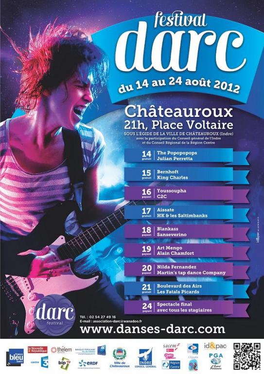 Et c’est parti pour les locations des spectacles du festival Darc 2012 ! On peut dès maintenant réserver son ticket pour les soirs de concerts payants de la place Voltaire (21h), à Châteauroux : jeudi 16 août, Youssoupha et C2C (29 €); samedi 18 août, Blankass et Sanseverino (33 €); dimanche 19 août, Art Mengo et Alain Chamfort (33 €); lundi 20 août, Nilda Fernandez et Martin’s tap dance Company (15 €); vendredi 24 août, le spectacle final de danse (15 €). Infos pratiques sous le lien.