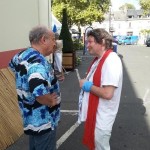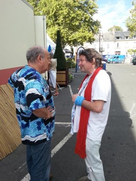 Le chanteur de la Boîte de Jazz est bien arrivé, place Voltaire, où il donne, ce soir, son concert ! Vers 18 h, il a achevé ses balances et en a profité pour taper la causette avec Eric Bellet. Vous avez vu, ils font la même taille !