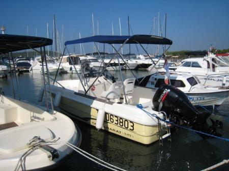 Post Scriptum : Il s’agit d’un bateau de type Cap Camarat, coque jaune clair. Remorque immatriculée en Belgique (QHR 408).