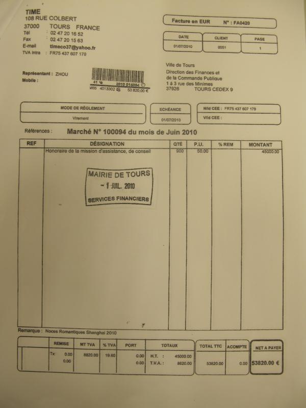 Toujours en 2010, les factures de Time Lotus-Bleu liées aux »honoraires de la mission d’assistance et de conseil »se sont avérées conséquentes : 107.640 € au titre du marché public n°090197, et 143.520 € pour le marché n° 10094 qui concernait plus particulièrement « l’exportation » des Noces Romantiques à la mode tourangelle à l’Exposition universelle de Shanghai. Soit un total de 251.160 € pour la Ville de Tours, rien que pour cette année-là…