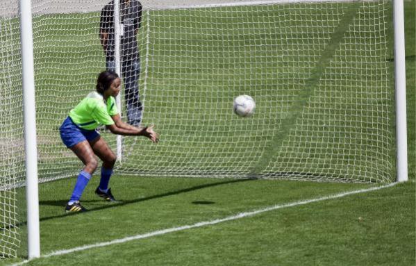 Bon, il faudrait commencer par expliquer à cette jeune gardienne prometteuse que pour arrêter les tirs, vaudrait mieux se mettre DEVANT la ligne de but.