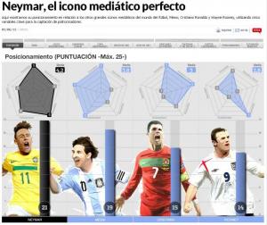 Neymar a vingt ans, un talent fou… et une côté médiatique supérieure à celle de Messi selon Marca America. A l’aide d’un graphique dynamique (qui artistiquement déchire), le media explique pourquoi son crack obtient une notation globale de 21 sur 25 critères, devant Messi, Cristiano Ronaldo ou Wayne Rooney.