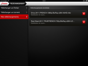 Parallèlement, après avoir trouvé un répertoire pour fichiers torrent grâce à Google, je copie l’adresse du fichier meta du film qui m’intéresse et je la colle dans mon appli Ipad Freebox Connect. Je clique ensuite sur « Télécharger ».