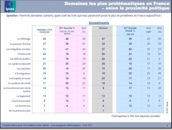 Si les Français ne croient plus vraiment au clivage idéologique entre la gauche et la droite, près des deux tiers acceptent pourtant de se positionner. D’autant plus lorsqu’ils sont sondés sur le regard qu’ils portent sur la société. Deux conceptions émergent qui se cristallisent, à gauche, autour de la notion d’égalité, à droite autour des préoccupations sécuritaires. Ainsi, 43% des sympathisants socialistes estiment que les inégalités sociales comptent parmi les principaux problèmes que rencontrent notre pays, contre seulement 20% à droite. Les chiffres se renversent sur l’insécurité, qui préoccupe 20% des sympathisants de gauche et 34% à droite. A gauche, 62% estiment que le fonctionnement de la société aggrave les inégalités, alors qu’à droite, ils sont autant à estimer qu’il permet de les corriger.
