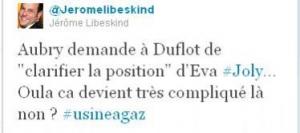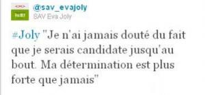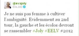 Eva Joly, qui depuis le début de sa campagne, comme pas mal d’autres ténors d’EELV, lui répond, une fois de plus, du haut de son compte twitter. Enfin celui qui a été créer quelque jour plus tôt pour assurer son service après vente (et qui s’avère plutôt utile…)
