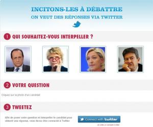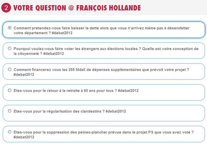 Ainsi, l’internaute peut demander au candidat socialiste « Comment prétendez-vous faire baisser la dette alors que vous n’arrivez même pas à désendetter votre département ? » A la chef de file d’EELV : « Vous proposez 48 Mds€ de hausse d’impôts, comment relancer l’économie avec un tel boulet ? »