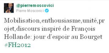 Au PS, sans surprises, un concert de louanges, Pierre Moscovici en tête. Et aussi Anne Hidalgo, qui a trouvé que « Le meeting de François Hollande au Bourget aura été inoubliable : fort, républicain, lucide et plein d’espérance », ou Harlem Désir qui a tweeté à la « fin du meeting impressionnant de François Hollande. Impossible de tweeter pendant vu l’affluence ! Un très grand discours ! ».