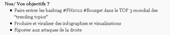 A peine les portes du Zénith du Bourget refermées derrière le discours d’1h23 de François Hollande, le 59 rue de Ségur -siège de campagne du parti socialiste – ouvrait ses portes au internautes de tous bords – numériquement parlant, politiquement, fallait être à gauche – pour une nuit du web. Pizza et coca à volonté pour les blogueurs, twitteurs et autres plumes du web qui voulaient bien se prêter à une opération hashtags. Objectif :