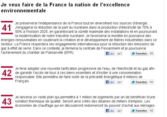 - Depuis la signature d’un pacte écologique a minima avec Europe Ecologie-Les Verts, le Parti socialiste a relégué les questions écologiques au second, voir au troisième plan. François Hollande ne l’a même pas évoqué dans l’exaltation de son discours du Bourget. Sur le papier, il y consacre seulement trois de ses 60 propositions. Dans la première, il reprend les termes de l’accord signé avec Europe Ecologie-Les Vert : réduction de 75% à 50% de la part du nucléaire dans la production d’électricité d’ici 2025, soutien aux filières de l’énergie renouvelable, fermeture de la centrale de Fessenheim. La seconde, qui propose une tarification progressives de l’eau, du gaz et de l’électricité, concerne finalement plus la lutte contre la précarité énergétique. La troisième promet un vaste plan d’isolation thermique.