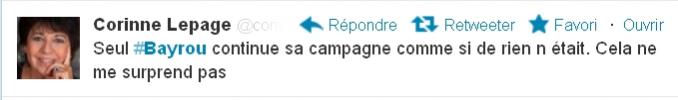 Désormais, les dix candidats devront trouver le ton juste pour poursuivre la campagne. Nicolas Sarkozy a annoncé à 19h30 qu’il suspendait sa campagne « au moins jusqu’à mercredi », jour où est prévu l’enterrement des trois militaires abattus. Un peu plus tôt, François Hollande avait annulé on passage sur Canal + le soir même, ainsi que son meeting prévu mardi. Corinne Lepage a annoncé aussi, sur Twitter, qu’elle s’exprimerait « ultérieurement » sur sa non-candidature. Marine Le Pen avait demandé à France 2 d’annuler le débat prévu le soir même avec Eva Joly et Arnaud Montebourg : « Je ne m’exprimerai pas sur ce qui peut de près ou de loin toucher à la politique aujourd’hui, nous attendons, et tout le pays attend, avec impatience, que ce tueur en série soit mis hors d’état de nuire pour que chacun d’entre nous, puissions respirer ». C’est un peu l’esprit de tous les candidats. Sauf François Bayrou, qui a maintenu son meeting a Grenoble… Ce qui lui a valu les railleries de son ex-alliée Corinne Lepage.
