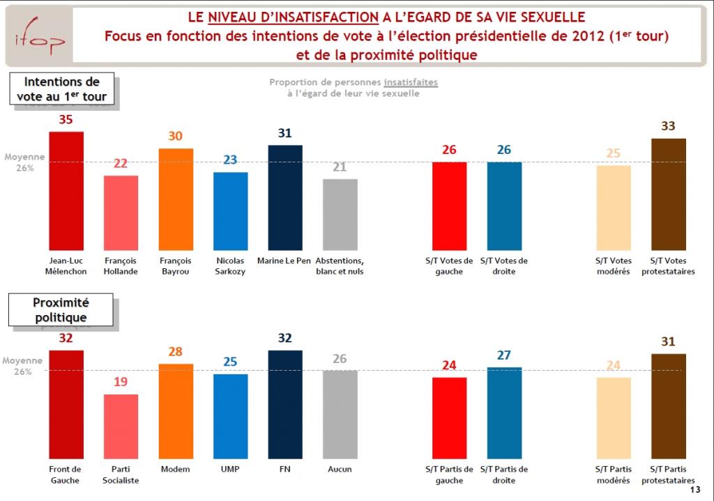 Parmi les principaux enseignements de ce sondage : il existerait un lien entre frustration sexuelle et vote contestataire. Et même, une tendance à aller vers les grandes gueules – Ifop dit « tribun ». Donc chez les frustrés, Jean-Luc Mélenchon et Marine Le Pen ont le vent en poupe (avec respectivement 35% et 31% d’intention de vote). L’Ifop précise que dans l’électorat de ces partis contestataires, « les personnes les plus insatisfaites sur le plan sexuel, à savoir les hommes, les quadras et les quinquagénaires et, sociologiquement, les inactifs, les ouvriers et les travailleurs indépendants, sont surreprésentées ». Donc, ce n’est pas parce qu’on est insastisfait au lit que l’on est attiré par Marine. Ou Mélenchon. Ni l’inverse. Aussi, il apparait que 63% des non-inscrits sur les listes électorales se déclarent satisfait de leur vie sexuelle, contre 71% chez les inscrits. Peut-on dire alors qu’aller voter peut être source de jouissance ?