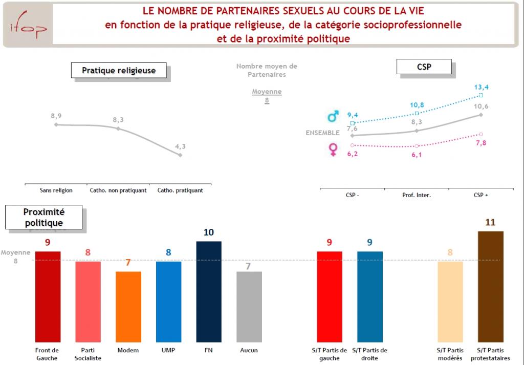 Sans rentrer dans les détails – on laisse ça à Hot Vidéo (c’est aussi disponible sur le site de l’Ifop) – le troisième enseignement du sondage est que « le répertoire des pratiques sexuelles est plus large et diversifié chez les Français exprimant un positionnement radical ou progressistes sur le plan politique« . Ainsi, les sympathisants de gauche et d’extrême gauche sont plus ouverts aux variantes que leurs alters egos de droite. La question à laquelle le sondage ne répond pas est : pour la drague, vaut-il mieux aller à une réunion des jeunes socialistes qu’à un meeting Ump ?