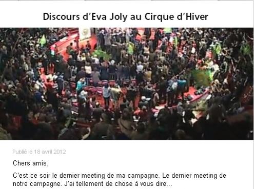Aphorismes, assonances, allitérations, anaphores et rimes riches. Auréolée d’une nouvelle plume – celle de son directeur de campagne Stéphane Sitbon-Gomez – Eva Joly est entrée en piste pour le dernier meeting présidentiel d’Europe Ecologie-Les Verts, mercredi au Cirque d’hiver, à Paris. Plus de 2.000 militants dans les tribunes, quelques uns dans une obscure succursale ou dehors, « debout sous la pluie ». Même si on ajoute ceux qui ont suivi d’un oeil ou d’une oreille la retransmission live sur le site evajoly2012.fr, on est loin des meetings géants des cadors de la campagne. Perdants d’avance sur les questions de taille, les écolos ont joué – un peu tard – la carte du « Eva pour tous et tous pour Eva ». L’ovni de la campagne (quoique Jacques Cheminade lui fasse une concurrence sérieuse…) les a convaincus avec un discours toujours atone, mais poétique et plein d’humour.