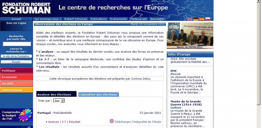 Le site de la Fondation Robert-Schuman met à la disposition des internautes les analyses et les commentaires de son observatoire des élections en Europe. Pour chaque scrutin dans la zone, la Fondation livre trois analyses : une générale, une à J moins 7 et un bilan post-élections.
