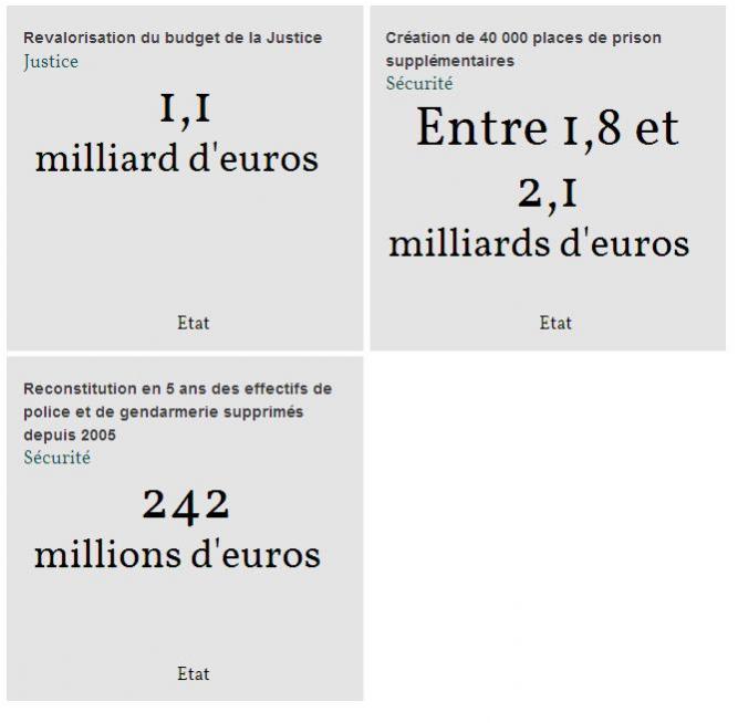 Revaloriser le budget de la justice, reconstituer les effectifs de police et de gendarmerie supprimés de puis 2005 et créer 40.000 places de prison supplémentaires ont un coût. Au total, le montant annuel de ces trois ambitions monte à quasiment 2,5 milliards en fourchette haute.