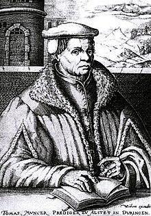 Page 46 : « C’est en essayant d’organiser la révolte en Thuringe, à Allstedt, que Müntzer se détacha des autres prédicateurs. Le fond devint social, enragé. La frange huppée de ses sympathies se mit à prendre peur. Il parlait d’un monde sans privilèges, sans propriété, sans Etat. Il excitait avec force contre l’oppression. Il appelait Luther “la chair qui mène molle vie à Wittenberg”. Il disait : “Il faut que le monde entier reçoive un grand coup ”. »